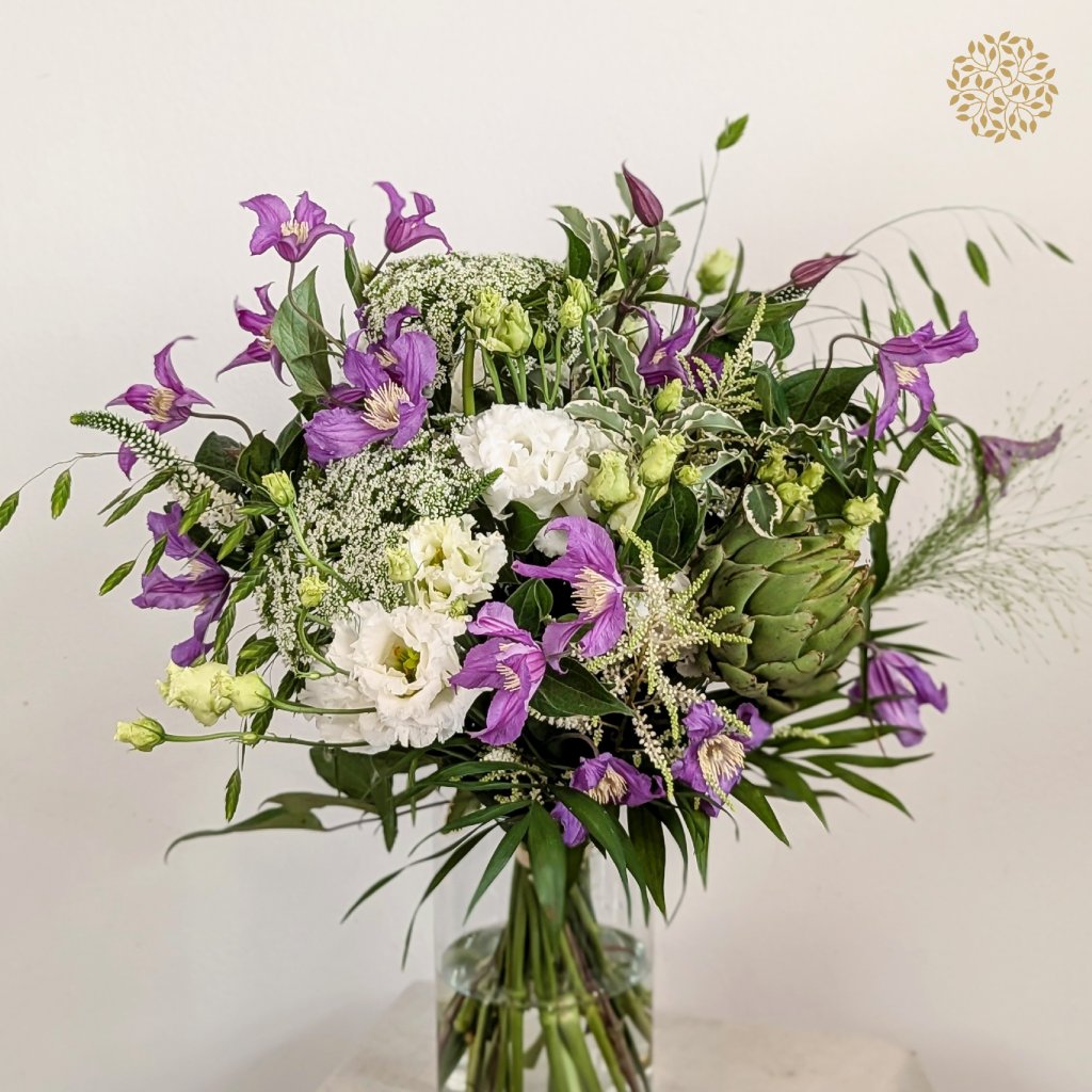 Kvetinový príbeh je kombinácia kvetov, ktoré vyprávajú o prírodnej kráse a elegancii. Fialový clematis, veronika, astilba, artičok, lisiantus, pittosporum, divoká mrkva a panicum vytvárajú zaujímavú kompozíciu, ktorá zaujme každého, kto hľadá niečo nezvyčajné a elegantné.